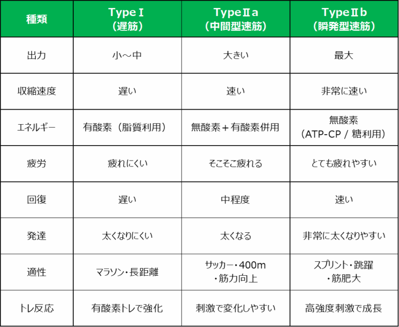 それぞれの生理的特性は大きく異なり、トレーニング効果や得意種目に直結します。